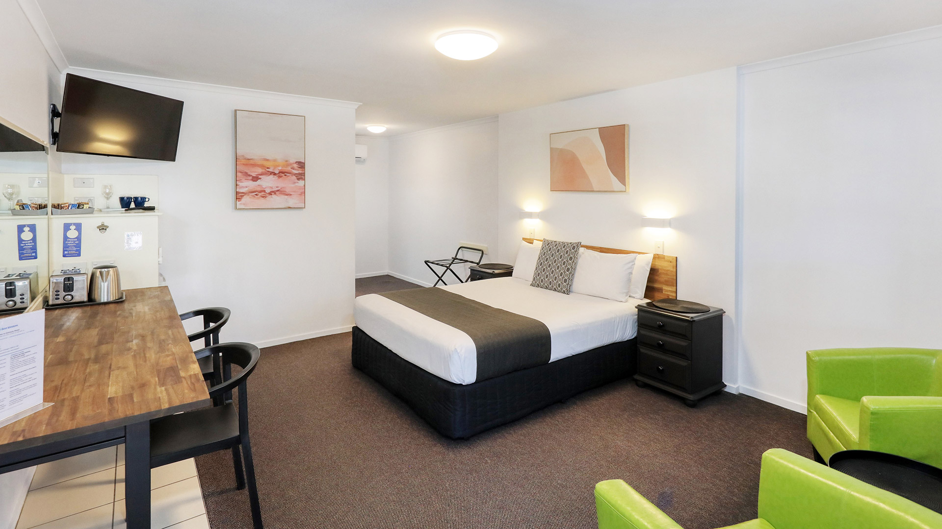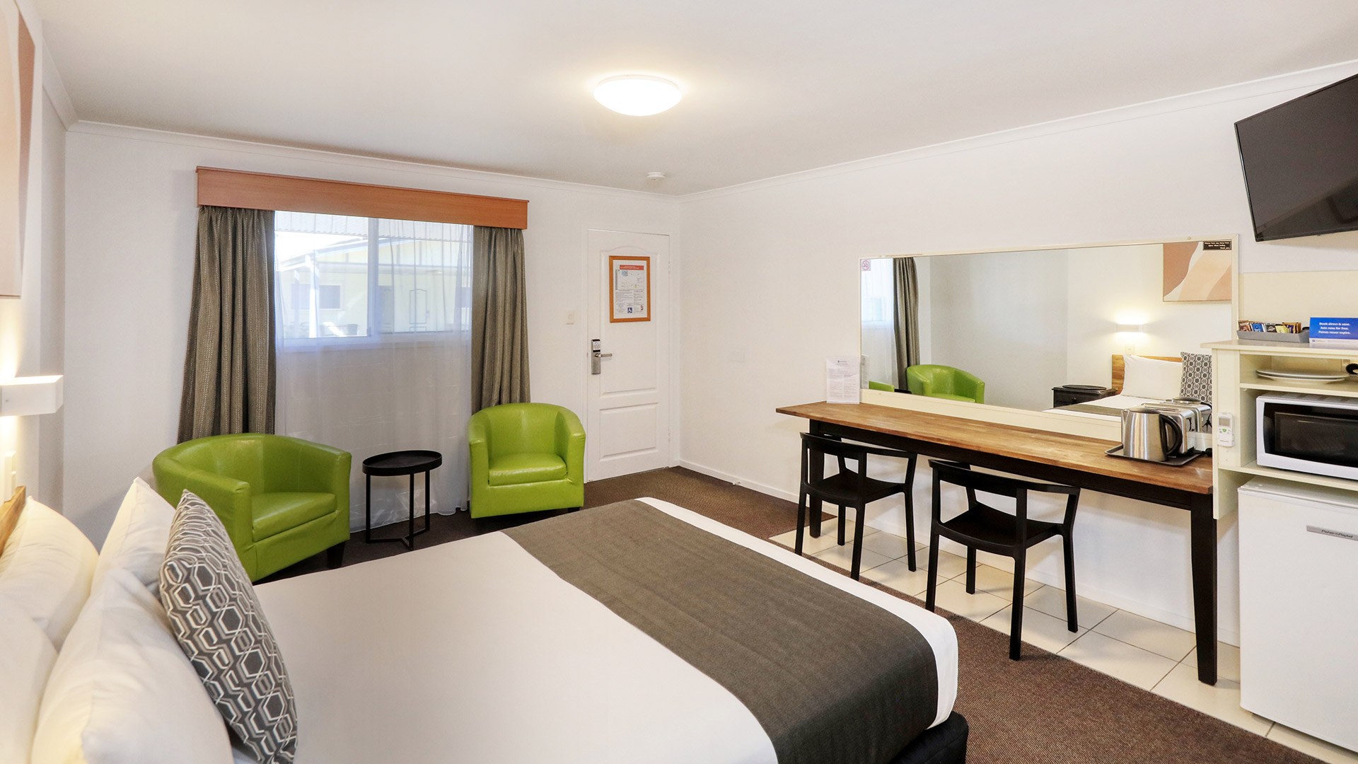 This room features a King size bed in a large combined bedroom and living space. The bathroom has a seperate walk in shower with complimentary toiletries. The lounge room has a 40 inch TV, microwave, toaster, tea and coffee making facilities and refrigerator. There is a large benchtop for eating meals or finishing off some after hours work. Free wifi is available throughout the whole property. This room is fully air-conditioned but opening windows too if you prefer. Undercover and secure parking is right outside your door.